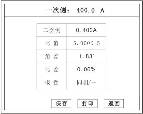 按額定一次的:1%、5%、20%、100%、120%取值,同時顯示出角差與比差。