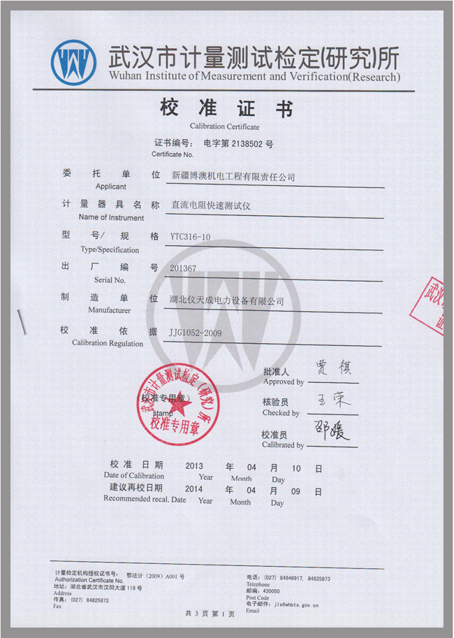 轉載:"YTC316-10直流電阻測試儀鑒定證書" 請注明來源于儀天成電力。 更多技術問題請致電儀天成電力客戶服務:027-87876585,技術部專線:027-87876585,在線客服:719388481